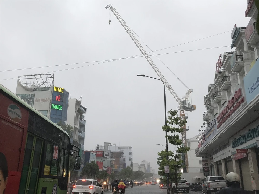 Cần cẩu vắt vẻo ngang đường khi TP.HCM mưa lớn. Ảnh: L. THOA