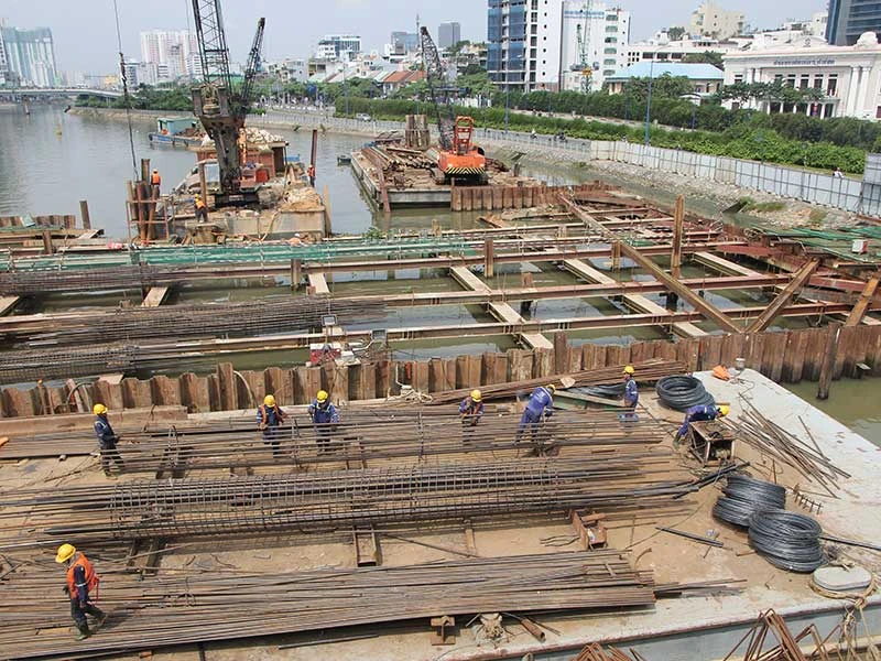 Thi công cống ngăn triều trên kênh Bến Nghé nằm trong dự án chống ngập của TP.HCM. Ảnh: HOÀNG GIANG