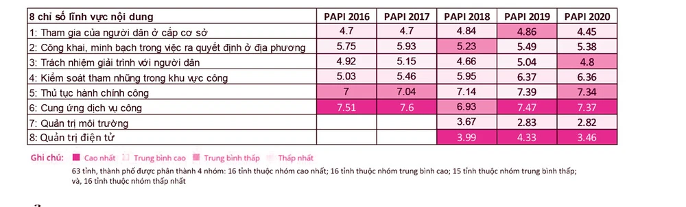 + Tôi xin lấy ví dụ một số chỉ tiêu nổi cộm dẫn tới mức điểm chưa cao ở ba lĩnh vực nội dung đầu của PAPI. Ví dụ ở nội dung thứ nhất về “tham gia của người dân ở cấp cơ sở”, dưới 50% số người được hỏi cho biết họ được mời tham gia đóng góp ý kiến khi địa phương chuẩn bị xây mới hoặc tu sửa công trình công cộng trong khi vẫn được yêu cầu đóng góp.