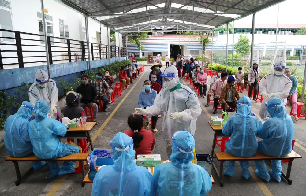 Người dân chờ lấy mẫu xét nghiệm COVID-19. Ảnh: HOÀNG GIANG