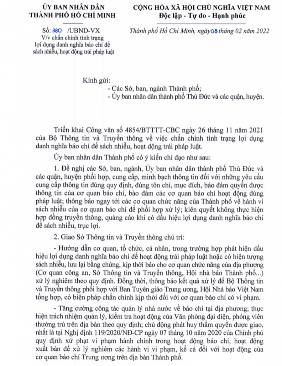 Ngày 8-2, UBND TP.HCM có văn bản gửi các sở, ban, ngành; UBND TP Thủ Đức và các quận, huyện về chấn chỉnh tình trạng lợi dụng danh nghĩa báo chí để sách nhiễu, hoạt động trái pháp luật.