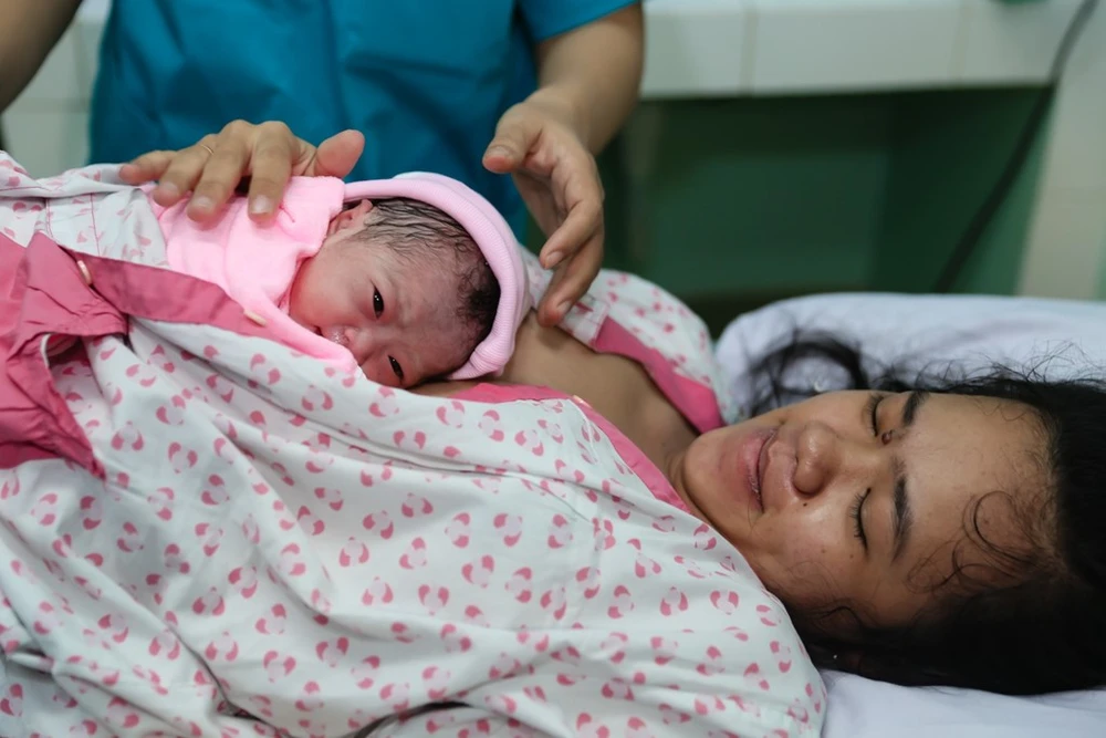 Em bé được cho nằm lên bụng để tiếp xúc với mẹ sau khi sinh.
