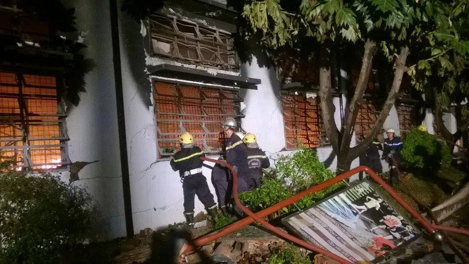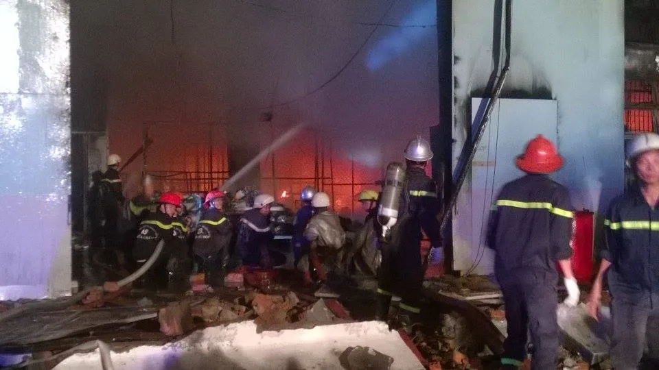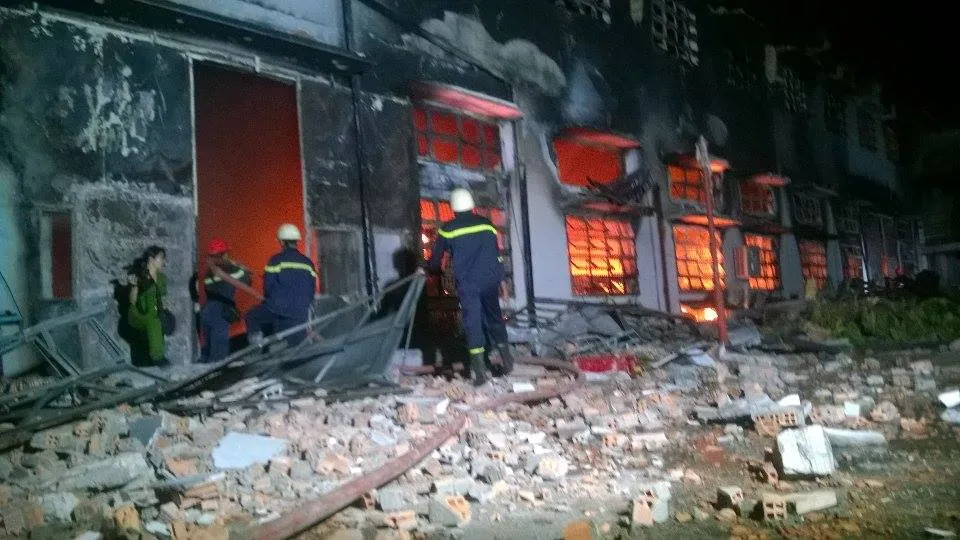Tại hiên trường, kho chứa hàng đã bị cháy rụi. Tường sập đổ. Diện tích kho hàng của công ty rộng hàng ngàn m2 đã đổ sập.
