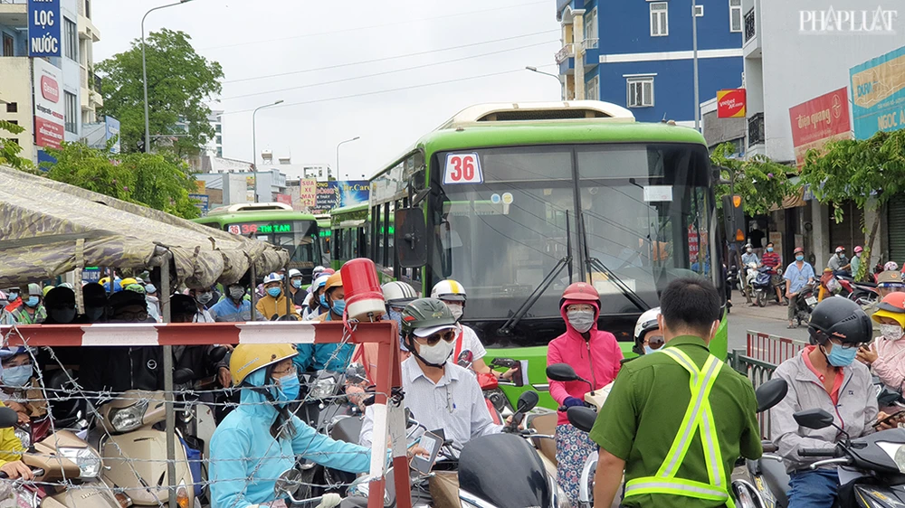 Tình trạng ùn ứ diễn ra tại một số chốt trạm kiểm dịch ra vào địa bàn quận Gò Vấp, TP.HCM sáng ngày 1-6. Ảnh NT