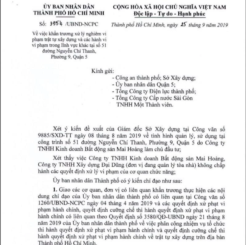 Do vậy, UBND TP.HCM chỉ đạo UBND quận 5 phối hợp với Công an TP.HCM có biện pháp kiên quyết đình chỉ hoạt động kinh doanh, cho thuê nhà tại tòa nhà số 51 Nguyễn Chí Thanh do Công ty TNHH Kinh doanh bất động sản Mai Hoàng làm chủ. Cấm đưa người và phương tiện sinh hoạt vào tòa nhà cho đến khi công trình hoàn tất các thủ tục pháp lý, nghiệm thu đưa vào sử dụng đúng quy định và chấp hành đầy đủ các quyết định xử lý của cơ quan chức năng.