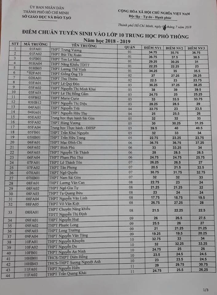 Bảng điểm chuẩn tuyển sinh lớp 10 của các trường THPT tại TP.HCM năm học 2018-2019.
