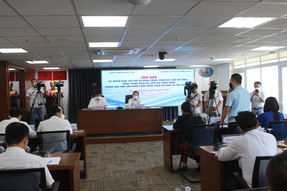 Sở GTVT TP tổ chức họp báo thông tin về vấn đề thu phí hạ tầng cảng biển. Ảnh: ĐT.