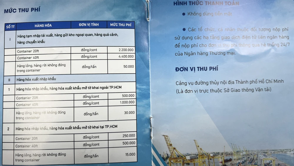 Ông Nguyễn Ngọc Tuấn, Giám đốc Cảng vụ Đường thuỷ nội địa TP.HCM cho biết sau thời gian thu phí thử nghiệm, tới 0 giờ ngày 1-4 sẽ chính thức thu phí sử dụng công trình kết cấu hạ tầng, công trình dịch vụ tiện ích công cộng trong khu vực cửa khẩu cảng biển (thu phí hạ tầng cảng biển).