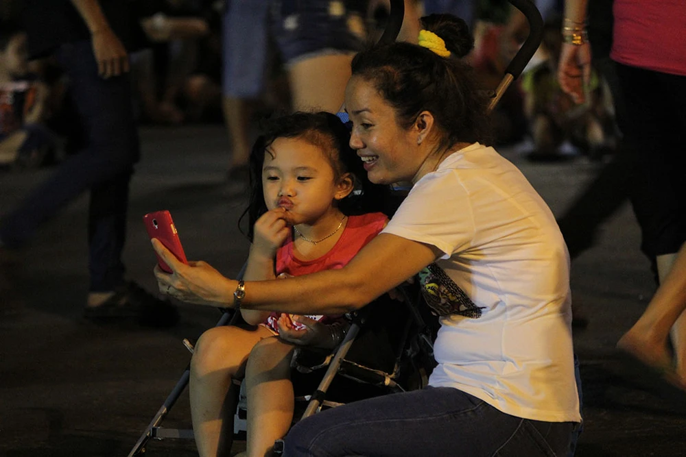 Hai mẹ con tranh thủ chụp ảnh trước giờ bắn pháo hoa.