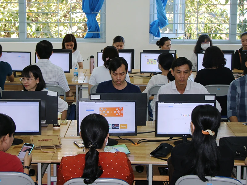 Trường THPT Nguyễn Du (quận 10, TP.HCM) tổ chức tập huấn dạy học trực tuyến cho giáo viên trong thời gian học sinh được nghỉ vì dịch COVID-19. Ảnh: NTCC