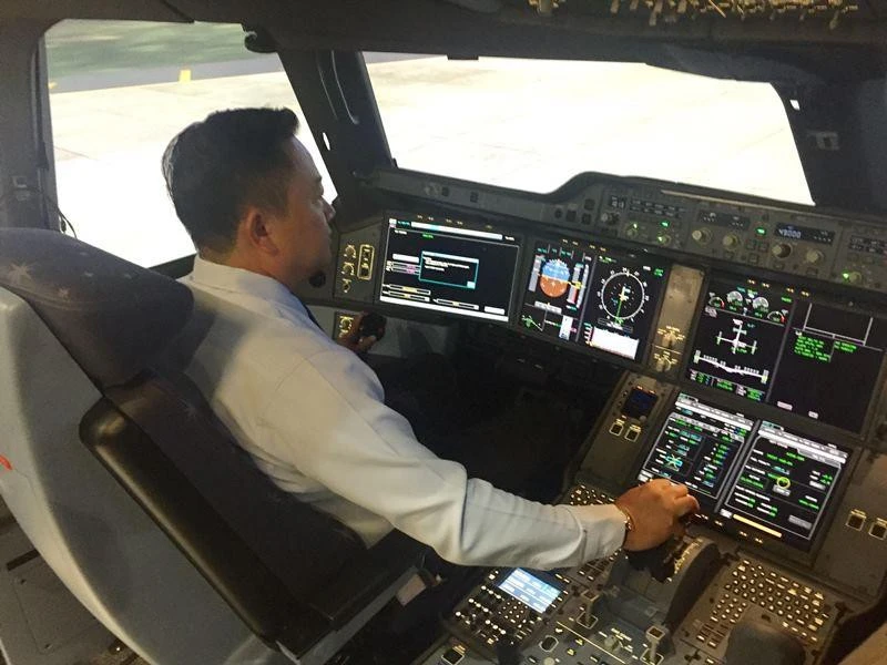 Giáo viên huấn luyện trên buồng lái mô phỏng máy bay thân rộng Airbus A350 tại Trung tâm huấn luyện bay, chi nhánh Tổng công ty Hàng không Việt Nam. Ảnh: PHONG ĐIỀN