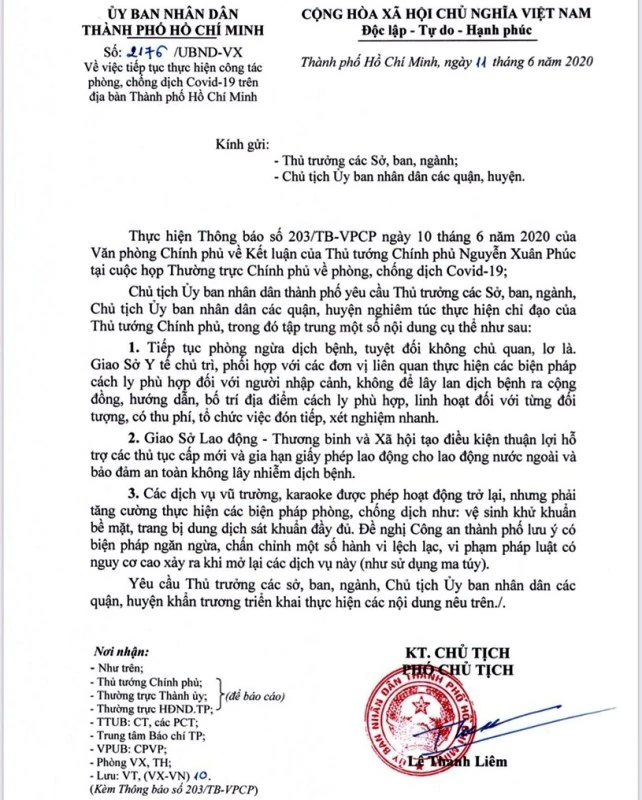 Chiều 11-6, Phó Chủ tịch Thường trực UBND TP.HCM Lê Thanh Liêm đã ký công văn số 2176 về việc tiếp tục thực hiện công tác phòng, chống dịch COVID-19 trên địa bàn TP.