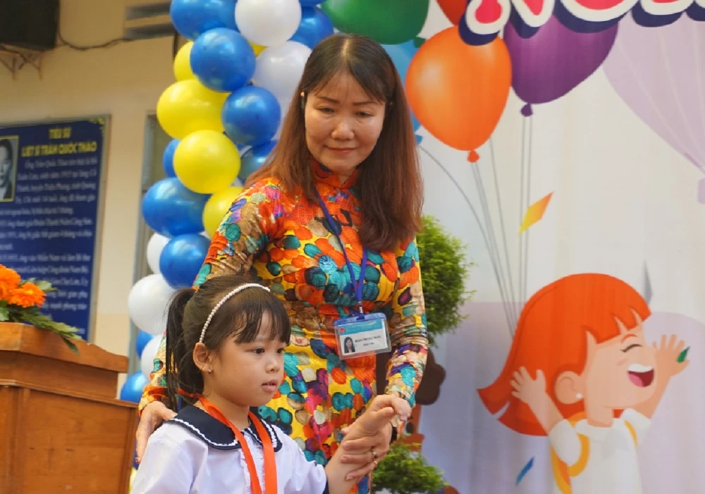 Cô trò trường tiểu học Trần Quốc Thảo trong "Ngày hội bé đến trường" năm học 2019-2020. Ảnh: NQ