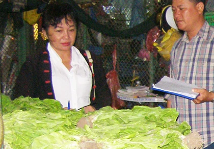 Chi cục Bảo vệ thực vật TP.HCM kiểm tra nguồn gốc rau cải kinh doanh tại chợ đầu mối Thủ Đức. Ảnh: TRẦN NGỌC