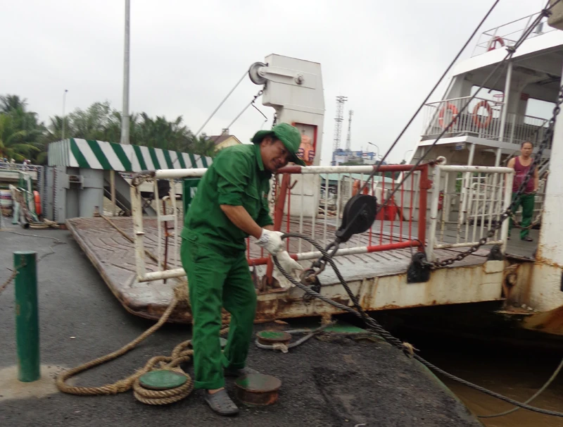 Tại bến phà Cát Lái, lúc 16 giờ nhân viên bến phà đi kiểm tra các loại dây, cáp neo buộc các phà không hoạt động vào vị trí an toàn.