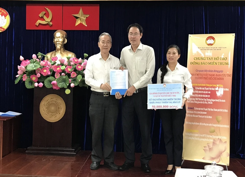 Riêng trong chiều 26-10, MTTQ TP.HCM tiếp nhận thêm sự ủng hộ của 14 tập thể, cá nhân với tổng số tiền hơn 3,2 tỉ đồng. Trong đó có NSND Tạ Minh Tâm, gia đình cố quyền Chủ tịch nước, Luật sư Nguyễn Hữu Thọ cùng nhiều tập thể như: BV Thống Nhất TP.HCM, Trường THCS-THPT Đức Trí, Sở Du lịch- Hiệp hội du lịch TP.HCM, đại diện các tôn giáo trên địa bàn TP…