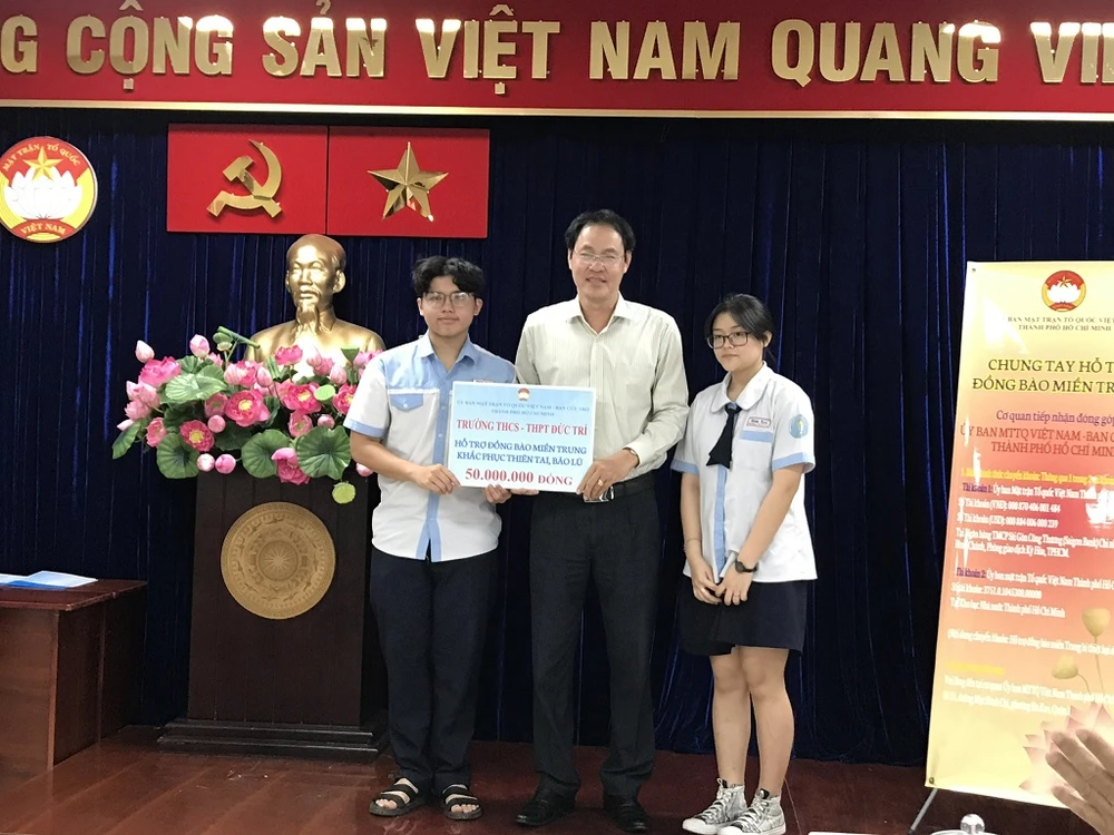 Hai học sinh đại diện cho Trường THCS-THPT Đức Trí trao số tiền do học sinh của trường quyên góp được cho MTTQ TP. Ảnh: THANH TUYỀN