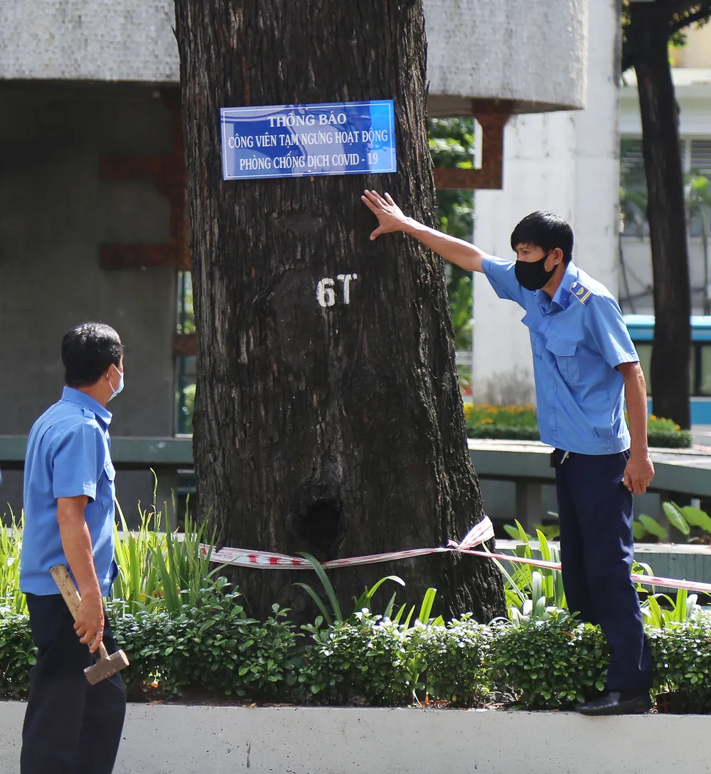 Nhân viên dán thông báo tạm ngưng hoạt động công viên hồ Con Rùa (quận 1) để phòng dịch COVID-19.