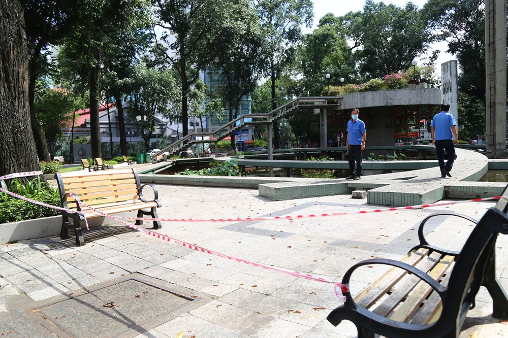Công viên Lê Văn Tám (quận 1) tạm ngưng hoạt động, các lối vào công văn được căng dây ngăn người dân vào trong.