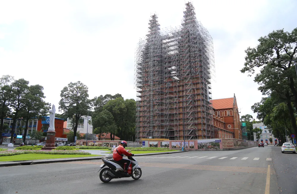 Khu vực nhà thờ Đức Bà, quận 1 vắng xe cộ, không có người đến dạo chơi.