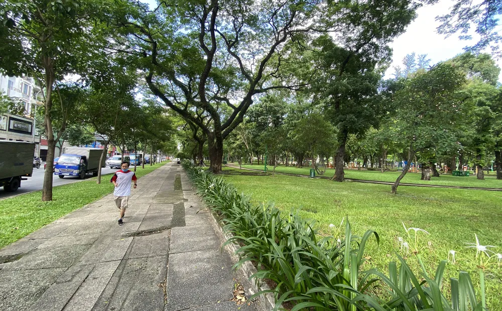 Người dân chạy bộ bên ngoài công viên Lê Văn Tám khi công viên này tạm ngưng hoạt động.