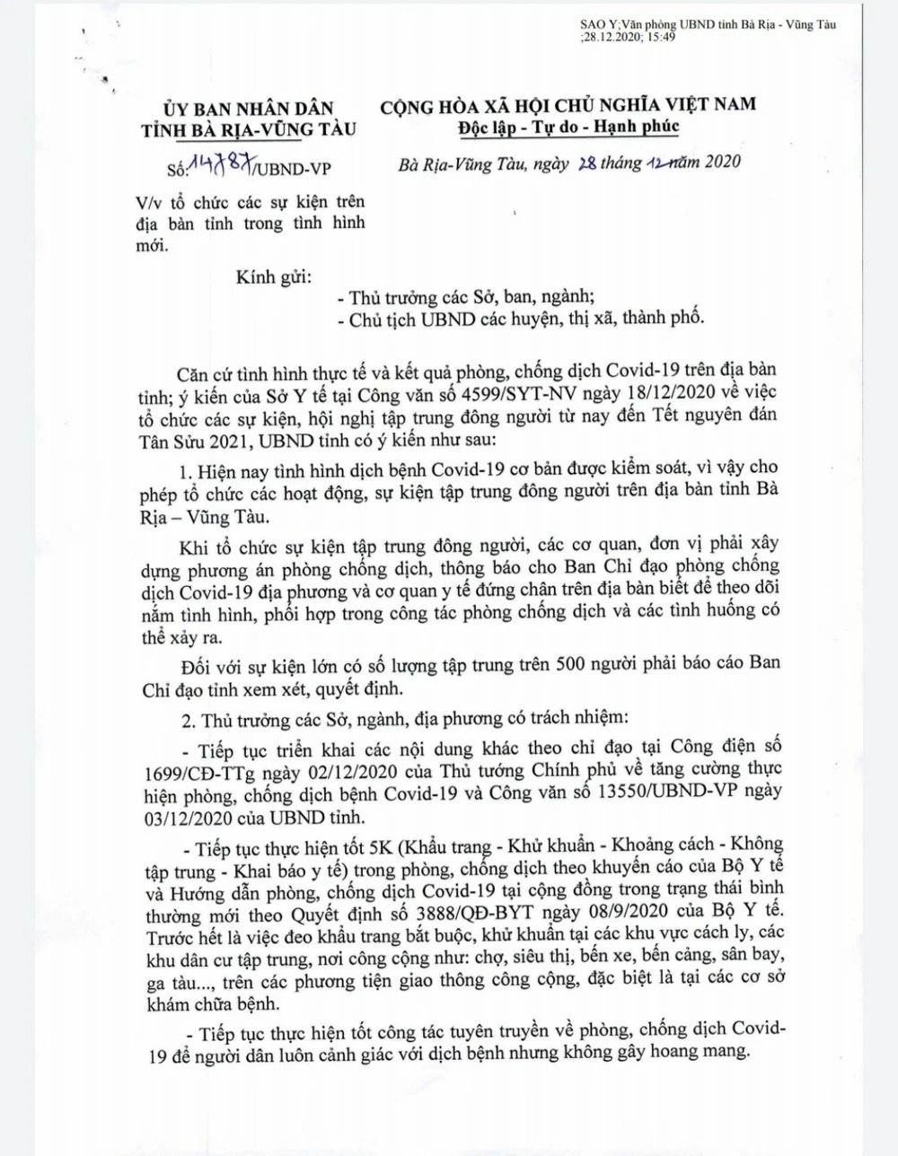 Chiều 28-12, UBND tỉnh Bà Rịa- Vũng Tàu có văn bản về tổ chức các sự kiện trên địa bàn tỉnh trong tình hình mới của dịch COVID-19.