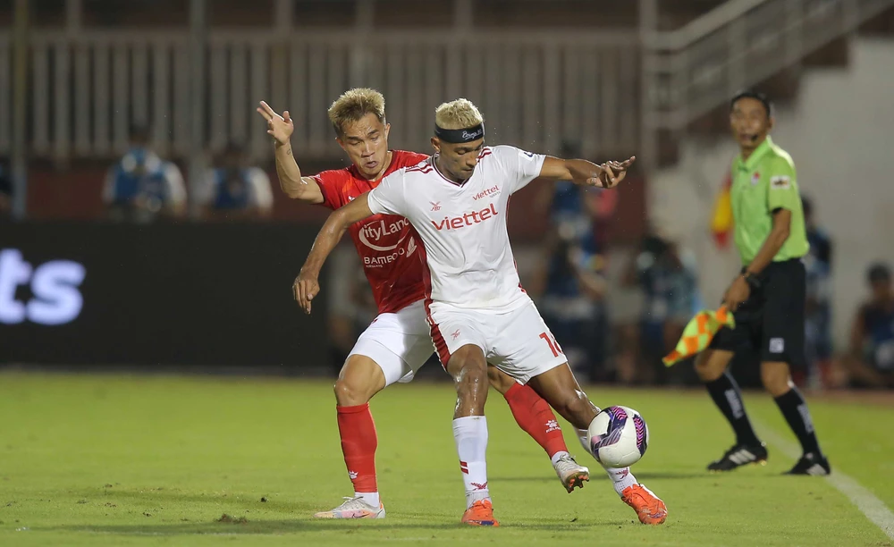 Bruno De Matos (trắng) mở điểm cho Viettel ở phút 16. Ảnh: ANH PHƯƠNG