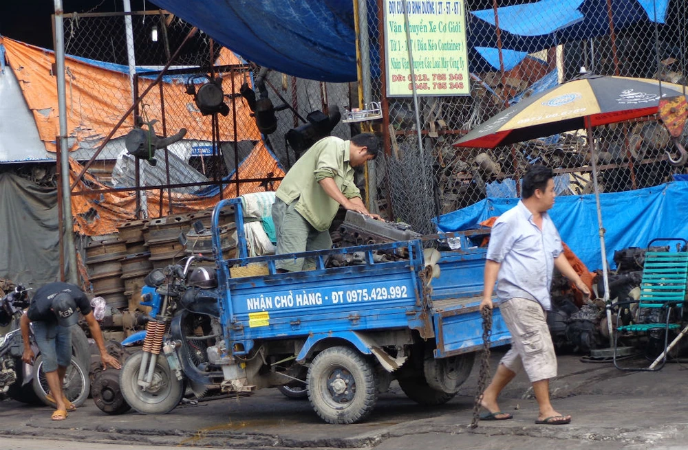 Một điểm "rã xác" xe bán cabin, các loại phụ tùng khác nằm trên đường dẫn lên cao tốc TP.HCM - Trung Lương thuộc địa bàn huyện Bình Chánh, TP.HCM