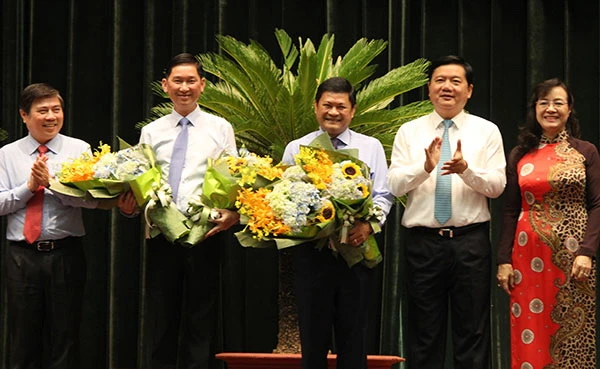 Lãnh đạo TP tặng hoa chúc mừng hai phó chủ tịch mới. Ảnh: HOÀNG GIANG