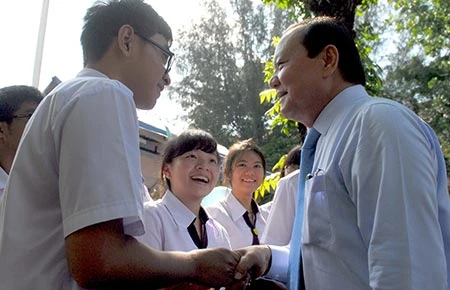 Bí thư Thành ủy TP.HCM Lê Thanh Hải thăm hỏi các học sinh nhân ngày khai giảng. Ảnh: HTD KSV không được uống cà phê với đương sự