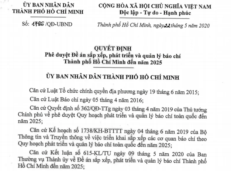 Quyết định của UBND TP.HCM về phê duyệt đề án sắp xếp, phát triển và quản lý báo chí đến năm 2025. Ảnh: TÁ LÂM