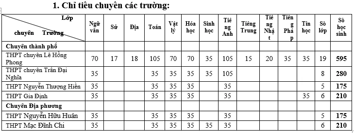 Trường THPT chuyên Lê Hồng Phong tuyển 180 chỉ tiêu không chuyên. Trường THPT chuyên Trần Đại Nghĩa tuyển 90 chỉ tiêu không chuyên.