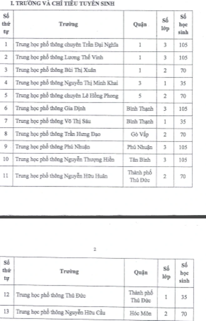 Chỉ tiêu tuyển sinh lớp 10 tích hợp của từng trường: