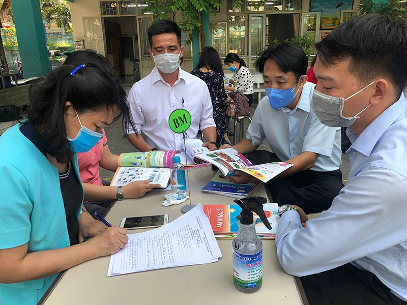 Giáo viên Trường Tiểu học Yên Thế, quận Tân Bình (TP.HCM) chọn lựa SGK lớp 1. Ảnh: NTCC