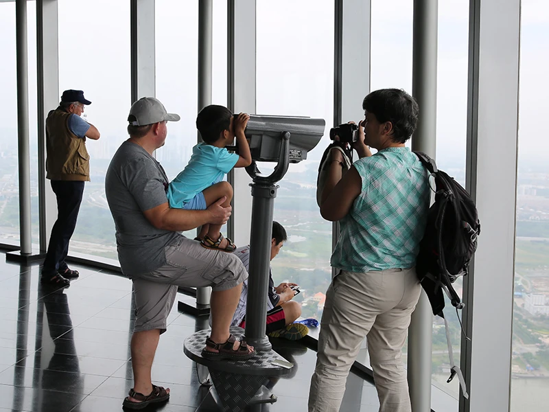Khách tham quan ngắm nhìn toàn cảnh thành phố từ đài quan sát (Saigon Skydeck) trên tầng 49 của tòa nhà Bitexco thời điểm trước dịch COVID-19. Ảnh: MINH ANH