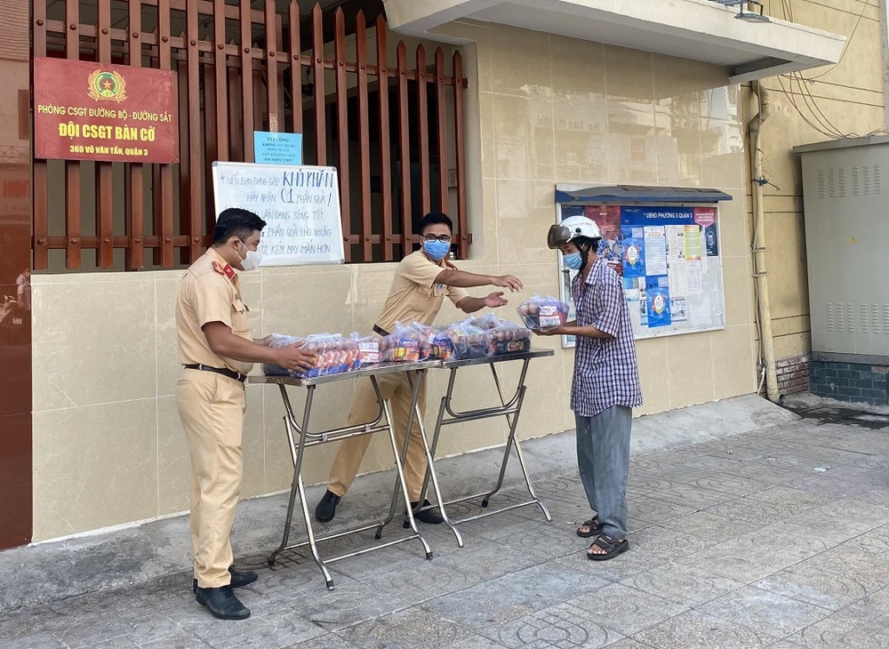 Chi đoàn Đội CSGT Bàn Cờ đã phối hợp với Chi đoàn Công an phường và Đoàn thanh niên phường 5, quận 3 tổ chức tặng mỗi ngày 50 phần quà là mì gói, trứng, nước mắm.. trước trụ sở đội cho các hộ dân, người có hoàn cảnh khó khăn trên địa bàn.