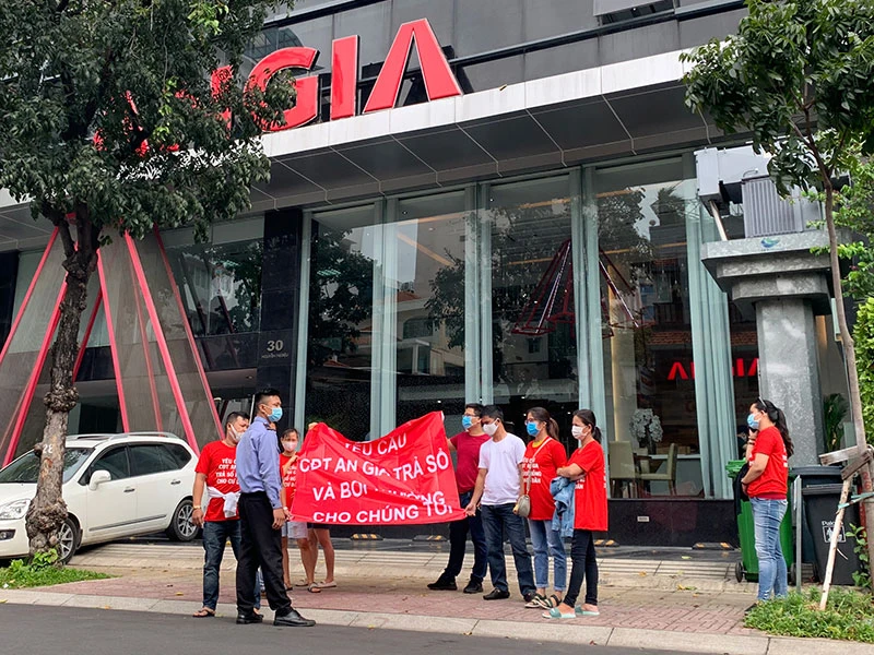 Sáng 1-8, nhiều cư dân chung cư The Star (quận Bình Tân, TP.HCM) đã đến trụ sở chủ đầu tư dự án này là Công ty CP Đầu tư và phát triển BĐS An Gia (công ty An Gia) tiếp tục căng băng rôn đòi chủ đầu tư thực hiện việc cấp sổ hồng.