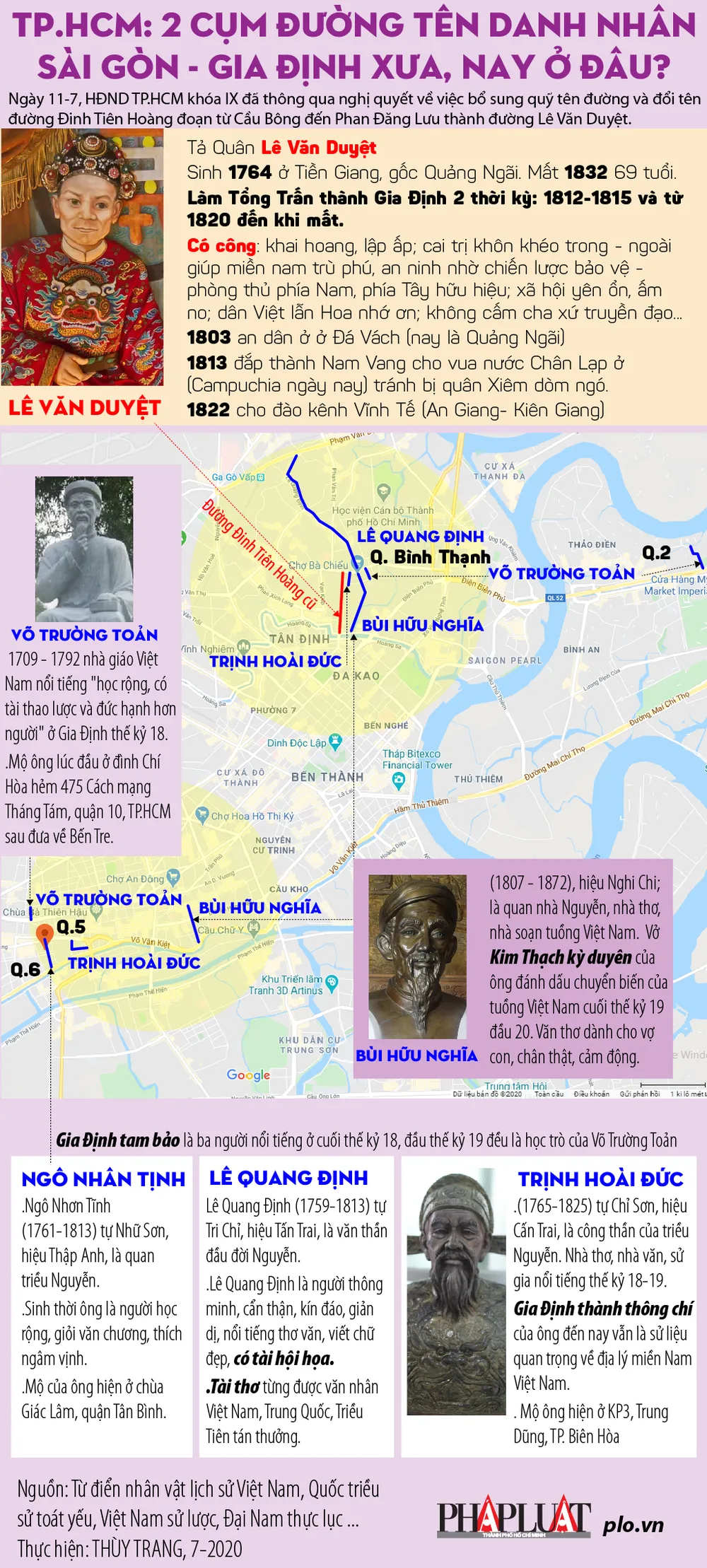 (PLO)- Ngày 11-7, HĐND TP.HCM khóa IX thông qua nghị quyết đổi tên đường Đinh Tiên Hoàng đoạn Cầu Bông đến Phan Đăng Lưu thành đường Lê Văn Duyệt. Việc này sẽ tạo thành cụm đường mang tên danh nhân thời Gia Định xưa như Lê Quang Định, Trịnh Hoài Đức, Võ Trường Toản, Bùi Hữu Nghĩa... giúp người dân dễ nhớ, dễ tìm.