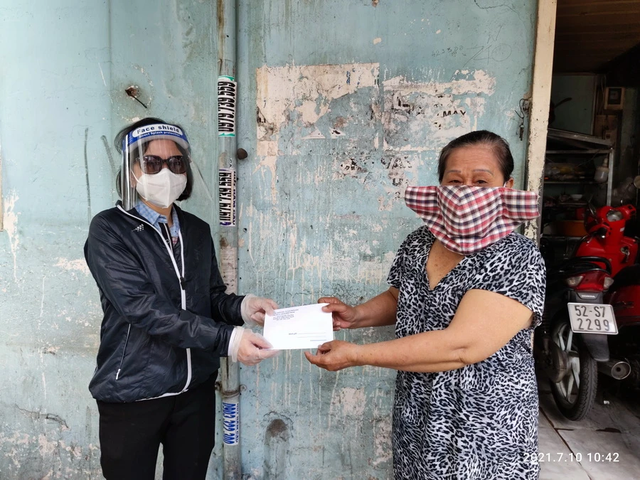 Bà Triệu Thị Bích Huyền (trái), Phó chủ tịch UBND phường 11, quận Bình Thạnh trao tiền hỗ trợ cho người dân. Ảnh: NGUYỄN HIỀN