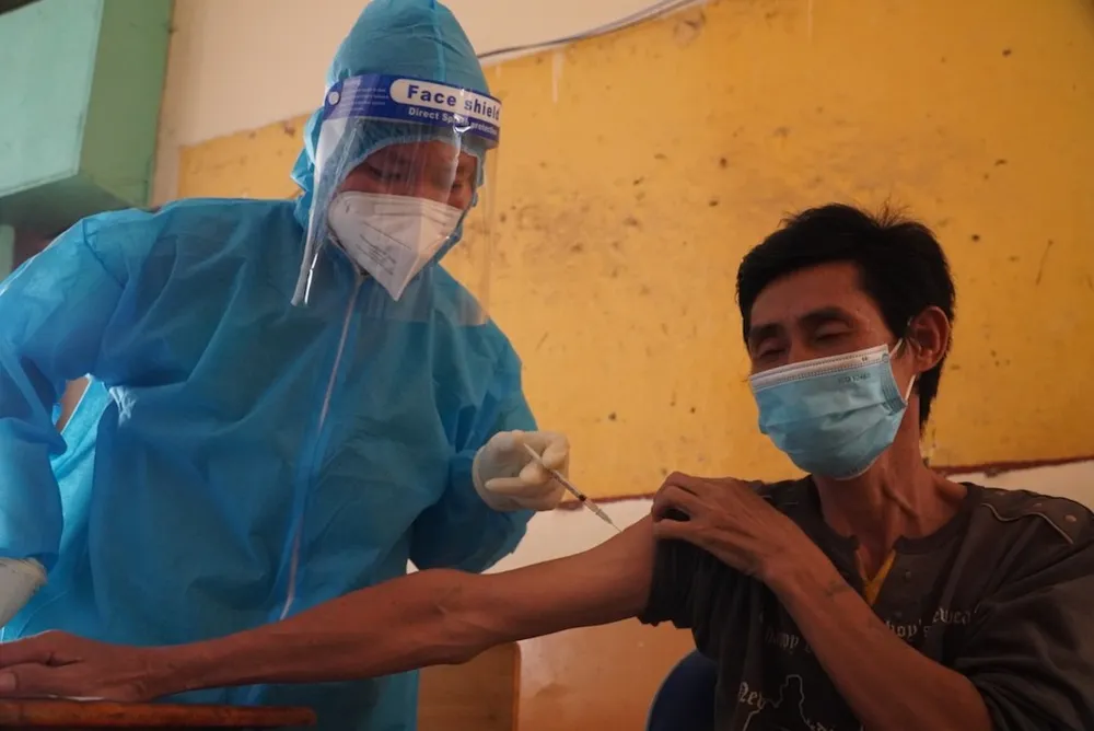 Tiêm vaccine cho người vô gia cư tại khu lưu trú tập trung ở trường THCS Nguyễn Huệ, quận 4. Ảnh: MINH TÂM
