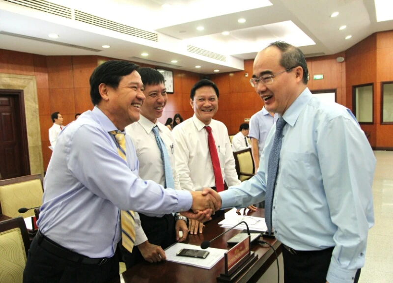 Bí thư Thành ủy Nguyễn Thiện Nhân với các đại biểu. Ảnh: HOÀNG GIANG