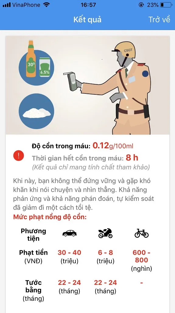 Điều đáng chú ý là app sẽ mô tả tình trạng sức khỏe tương ứng với các thông số trên. Đồng thời hiện các mức phạt về nồng độ cồn theo Nghị định 100/2019 đối với từng loại phương tiện.