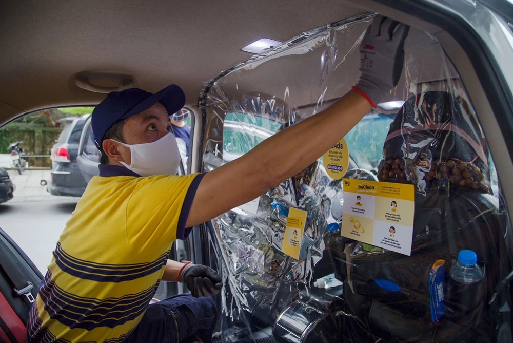 Tài xế một hãng xe công nghệ đang làm vách ngăn trên ô tô để đảm bảo phòng chống dịch. Ảnh: ĐÀO TRANG