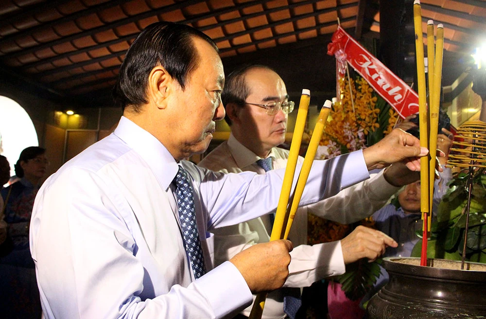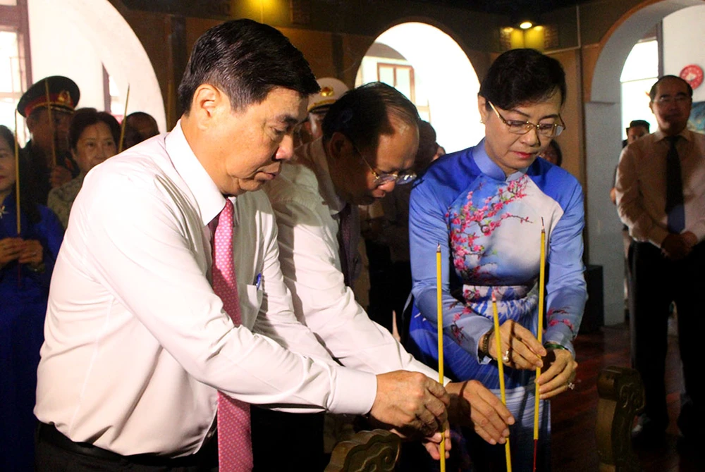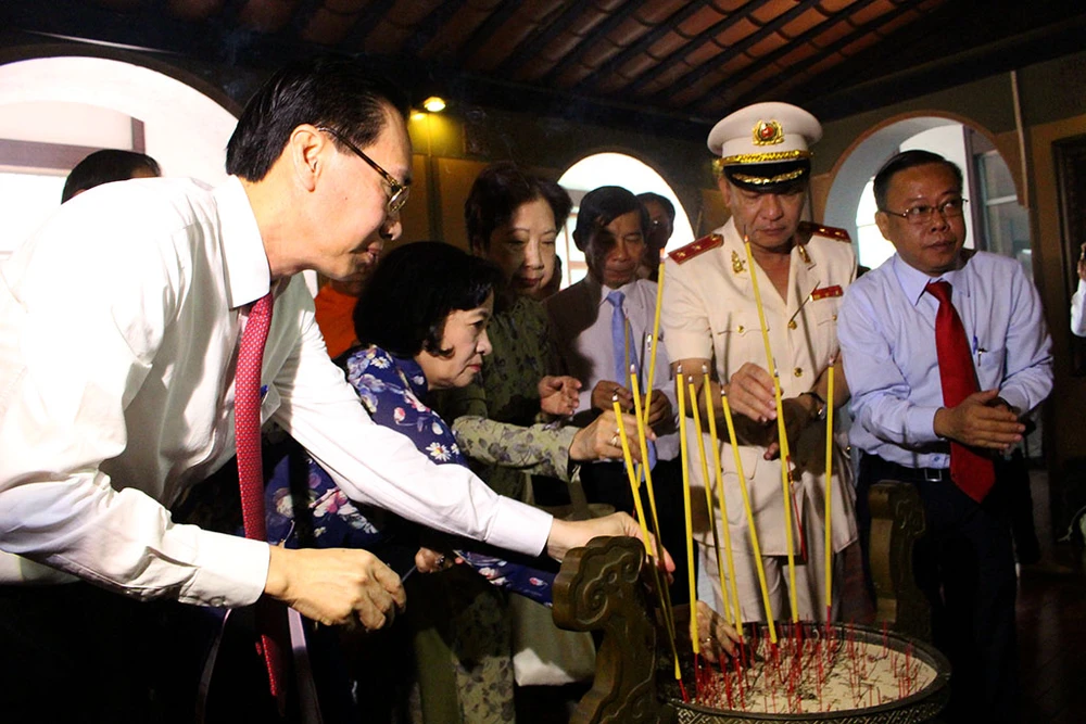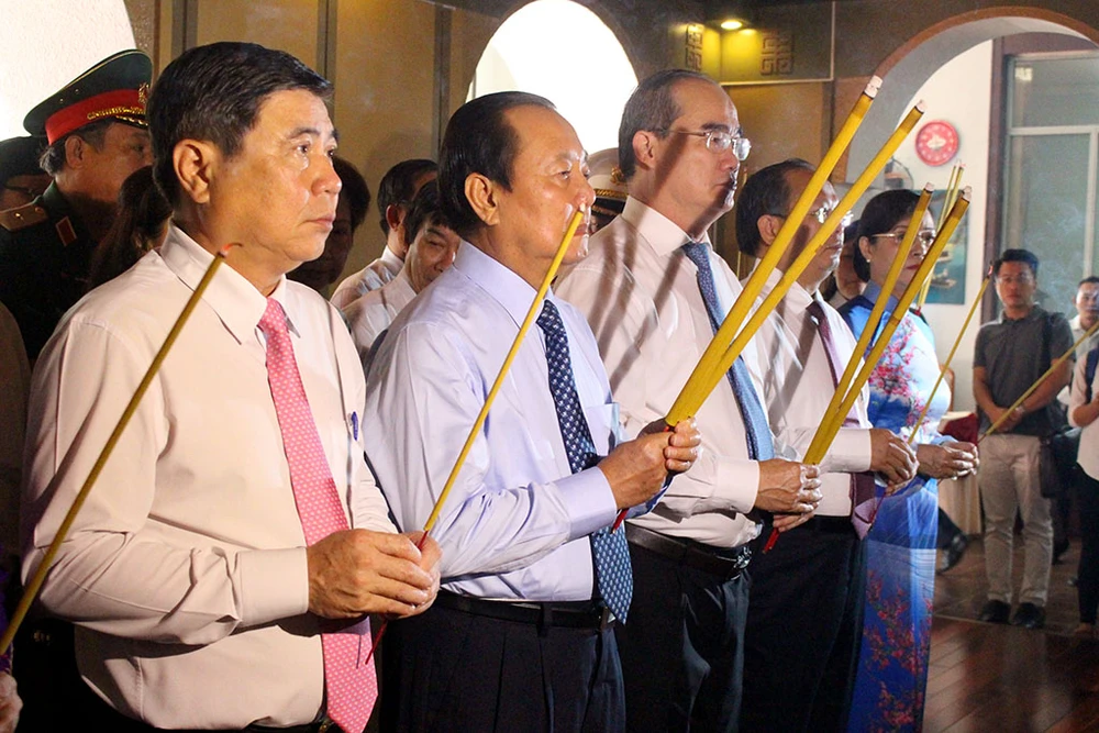 Lãnh đạo Thành ủy, HĐND, UBND, Ủy ban MTTQ Việt Nam TP.HCM cùng dâng hương lên Chủ tịch Tôn Đức Thắng. Ảnh: L.THOA