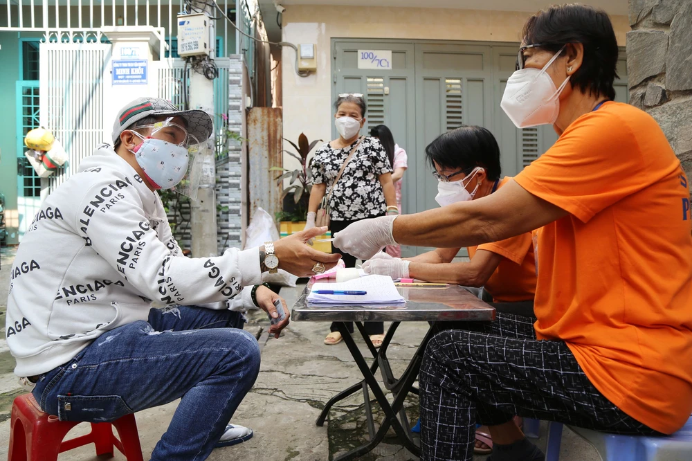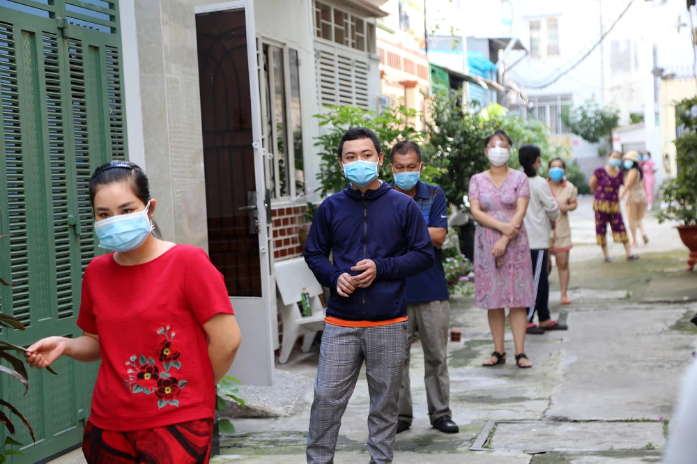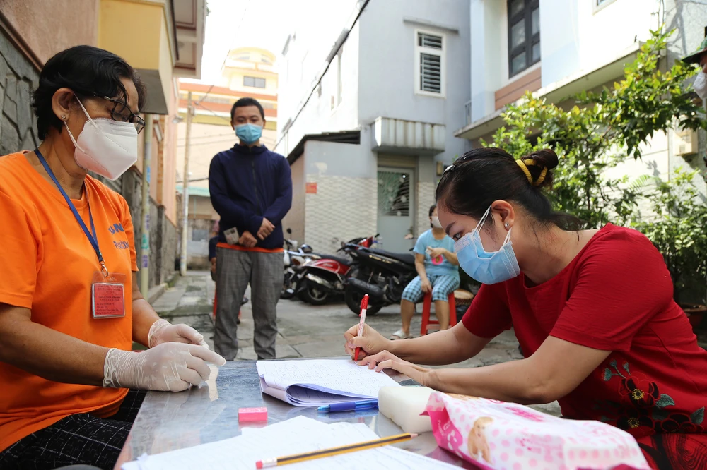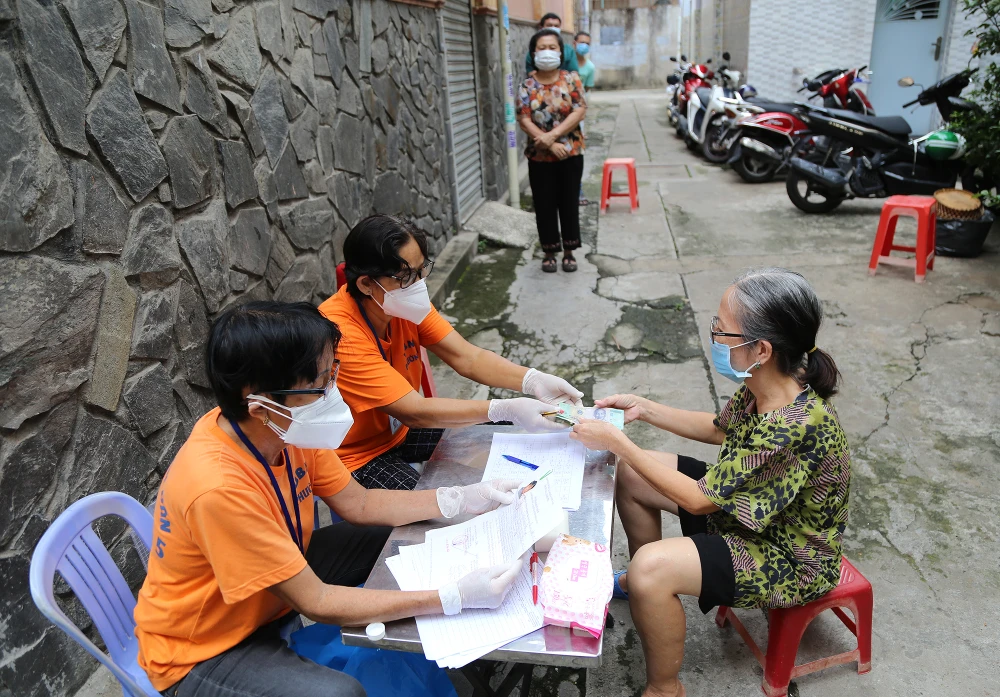 Ghi nhận tại khu phố 1 phường 5, quận Phú Nhuận. Ngay từ sáng sớm tổ chi tiền hỗ trợ của Tổ 1, Khu phố 1 đã sẵn sàng trên con hẻm 100 đường Thích Quảng Đức.