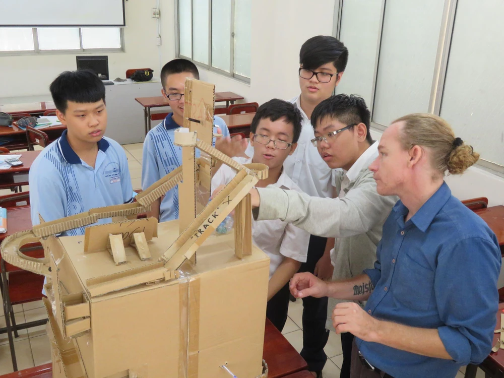 Học sinh Trường THPT chuyên Lê Hồng Phong trong tiết học thực hành môn Vật Lý với giáo viên nước ngoài. Ảnh: KB