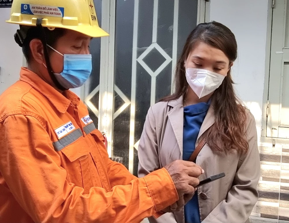 Nhân viên Điện lực hướng dẫn khách hàng sử dụng Ứng dụng (App) Chăm sóc khách hàng EVNHCMC.