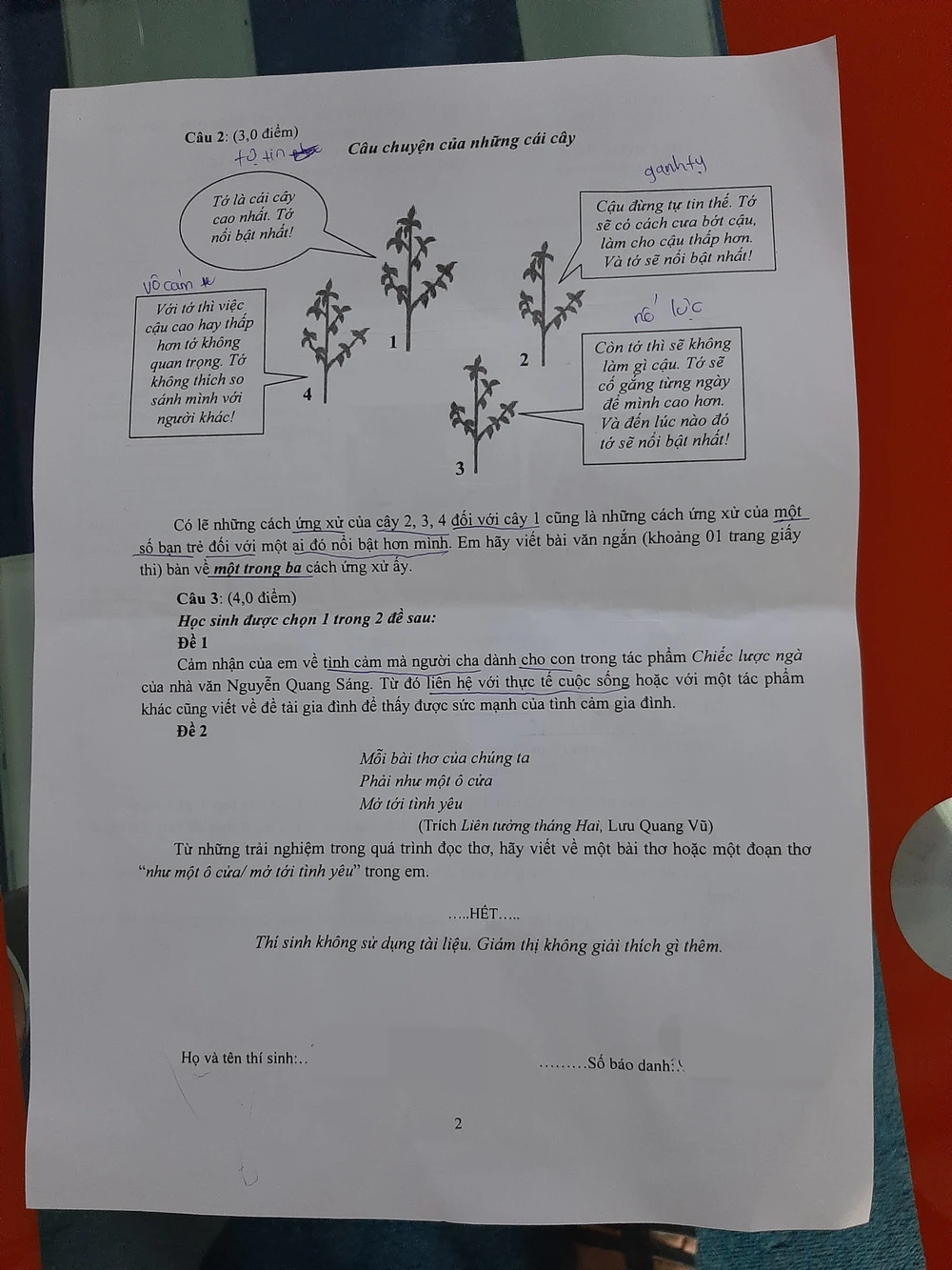 Nếu ở câu 1, thí sinh thấy được những thách thức của bản thận để khẳng định mình qua những hoạt động thiện nguyện, lan tỏa những điều tốt đẹp trong cộng đồng chiến thắng cái tôi nhỏ bé của riêng mình. Thì câu 2, dựa vào hình vẽ, thí sinh tuỳ vào quan điểm sống của mình để lựa chọn, lý giải một thái độ sống tích cực: không đố kỵ, so bì với người khác nhưng phải biết tự mình vươn lên để thành công và khẳng định sự khác biệt của bản thân.
