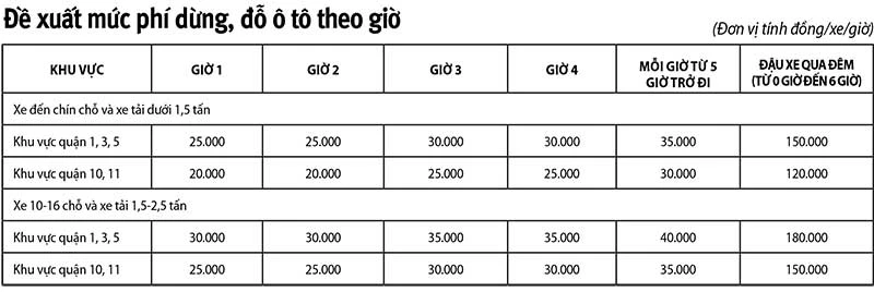 Theo tờ trình, Sở GTVT TP xây dựng mức phí áp dụng cho hai nhóm: Ô tô đến chín chỗ, xe tải dưới 1,5 tấn và ô tô từ 10 chỗ, xe tải trên 1,5 tấn đến dưới 2,5 tấn. Mức phí cũng thu theo hai khu vực gồm khu vực quận 1, 3, 5 (tạm gọi khu vực 1) và khu vực quận 10, 11 (khu vực 2).