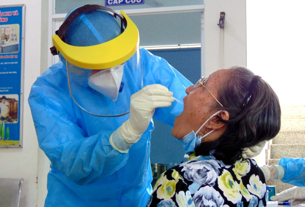 Nhân viên y tế đang lấy mẫu xét nghiệm SARS-CoV-2. Ảnh: TRẦN NGỌC